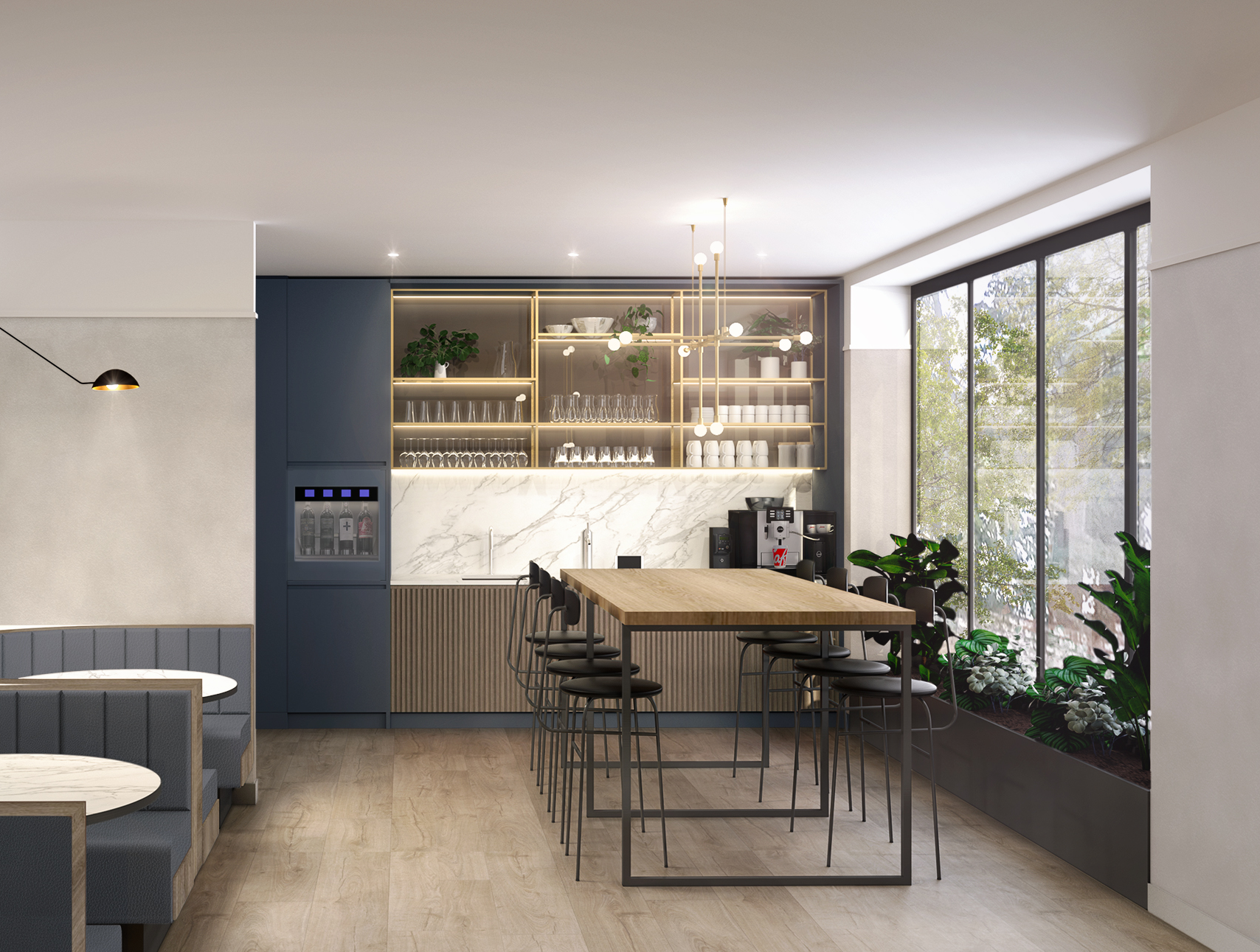 All the coworking spaces have a quartz worktop bar/ café zone and breakfast bar. Sparkling/still water and hot drinks are provided on tap, and an ice machine for events. These spaces have been designed flexibility, to allow for changes in layout should the operator require it at different times of the day.