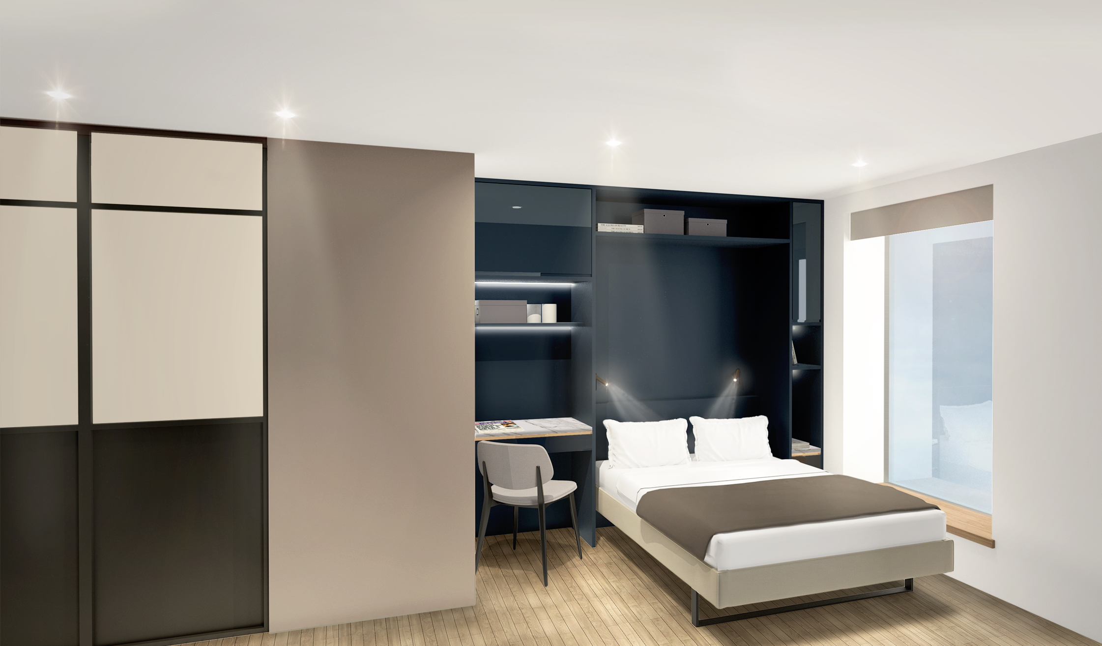 Each unit has been carefully designed to ensure the best use of space, high levels of natural light and outlook, and good quality appliance and furnishings. All floor to ceiling heights are 2.4m high (with 2.3m headheight in the bathrooms). All rooms have full sized bay windows (circa 2m in width) with integrated joinery seating ledge, with excellent natural light, and concealed black out blinds.